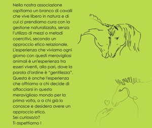 Nella nostra associazione ospitiamo un branco di cavalli che vive libero in natura e di cui ci prendiamo cura con la gestione naturalizzata, senza l'utilizzo di mezzi o metodi coercitivi, secondo un approccio etico relazionale. L'esperienza che viviamo ogni giorno con questi meravigliosi animali é un'esperienza tra esseri viventi, alla pari, dove la parola d'ordine è "gentilezza".