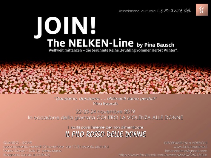 JOIN! THE NELKEN LINE è un progetto lanciato dalla Pina Bausch Foundation che intende coinvolgere tutti coloro che credono nel potenziale comunicativo e sociale del movimento e che vogliono unirsi alla celebre “camminata” tratta dallo spettacolo NELKEN del 1982, per essere parte attiva in un processo di condivisione dell’eredità di Pina Bausch, un’eredità non solo artistica ma anche poetica di integrazione tra culture, sensibilità e storie.