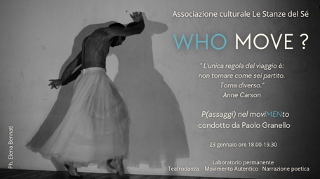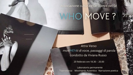 Il Laboratorio permanente WHO MOVE? nasce dal progetto diffuso WOMEN WE MEN WHO MEN dedicato al 25 novembre, Giornata Internazionale per l’Eliminazione della Violenza contro le Donne, un titolo che si interroga sul dialogo tra donne e uomini, sulle identità, le relazioni e le responsabilità di genere: Women – We – Men – Who – Men, su chi siamo, come ci riconosciamo, e soprattutto: come possiamo costruire insieme una cultura del rispetto e della cura reciproca?